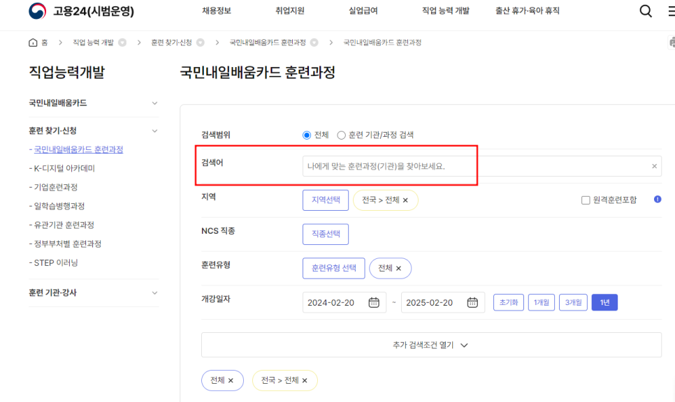고용24 홈페이지에서 훈련 찾기 신청 메뉴