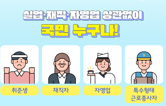 국민내일배움카드 신청을 위한 자격은 청년, 재직자, 구직자, 재취업자 등 훈련을 희망하는 국민이라면 누구나 신청할 수 있어요. 대학교 3학년도 발급받을 수 있구요. 졸업까지 남은 수업연한이 2년 이내인 대학(원)생도 혜택을 받을 수 있어요.