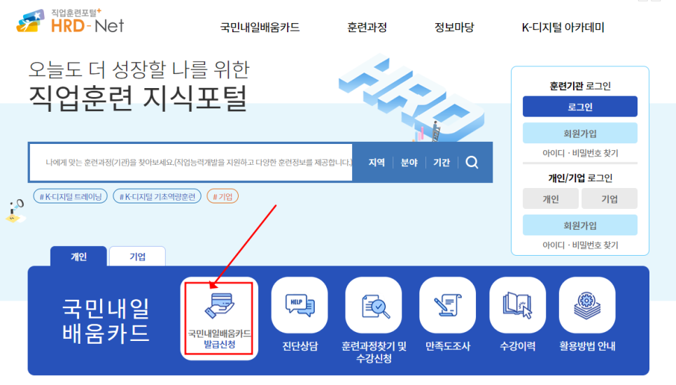 국민내일배움카드 신청을 위해서는 먼저 직업훈련포털 HRD-Net으로 접속하고 개인 메뉴탭에 있는 국민내일배움카드 발급신청 메뉴를 눌러주면 돼요. 로그인 또는 인증 과정을 거치고 나오는 단계를 따라서 신청하게되면 됩니다.