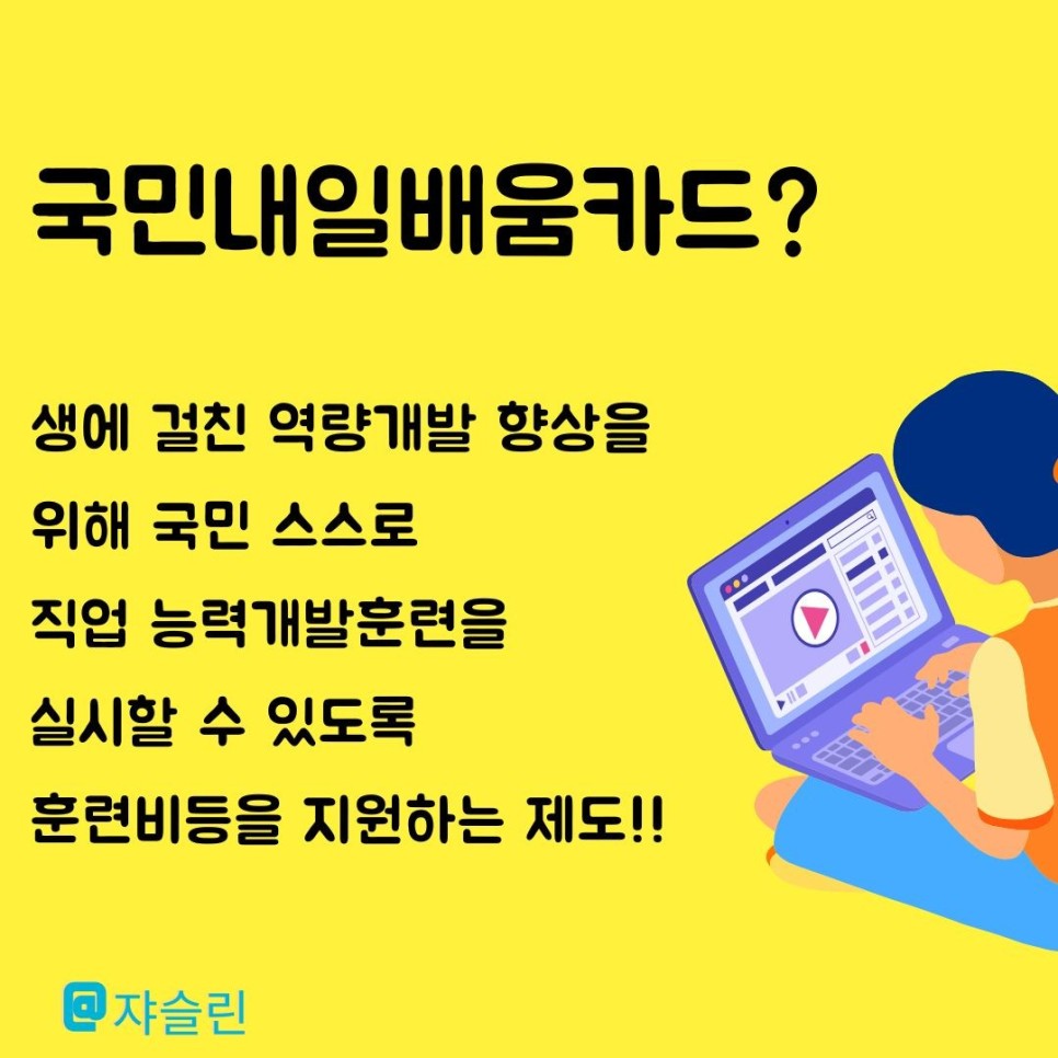 국민내일배움카드는 노동시장 변화에 대응하기 위해 국민 스스로 직업능력개발훈련을 실시할 수 있도록 지원하는 제도인데요. 취직해서 업무에 이용할 수 있을만큼의 무언가를 배운다는게 적은 비용이 드는 일이 아니므로 지원을 받을 수 있으면 많은 도움이 되겠죠.