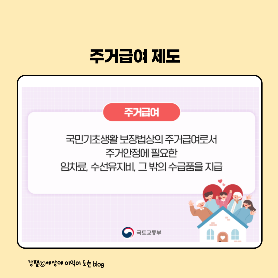 국민기초생활 보장법 제7조 및 제12조에 따라 수급자가 안정되고 건강한 주거생활을 영위할 수 있도록 주거임차료, 유지수선비 ,그밖의 수급품 등을 지원하는 제도입니다.