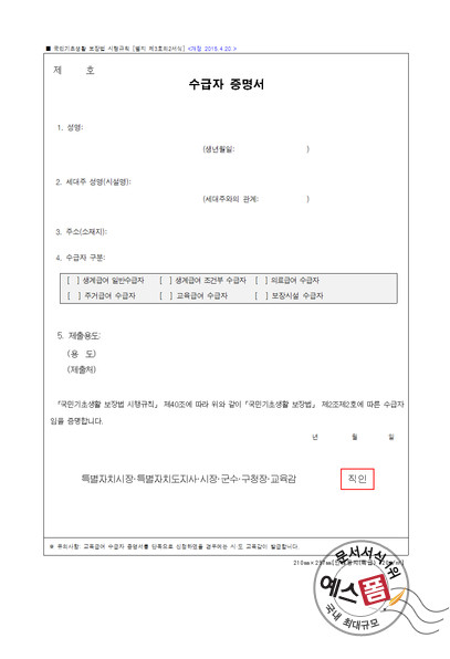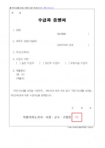 이러한 절차를 거치면 국민기초생활수급자 증명서 발급 과정이 끝나게 되어요. 완료가 되면 아래와 같은 수급자 증명서를 발급 받을 수 있어요.