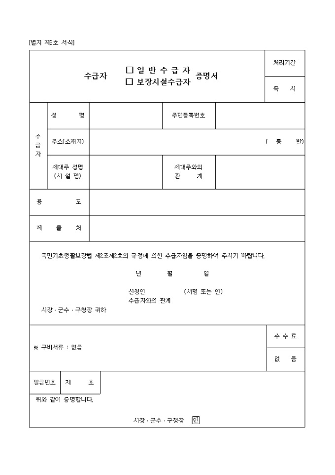 국민 기초생활수급자 증명서 발급에게는 복지 4대 급여 외에도 출산비, 장례비를 지원해 주고 있고,