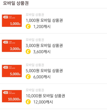 모바일 상품권은 예전에는 1:1 구조였는데 최근 변경되어 1.2캐시 : 1원으로 변경되었네요.