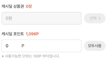 구입 후에는 어플 내에서 쇼핑하면서 위와 같이 상품권을 적용하면 되고 또한 결제하면 포인트까지 지급해 줘서 위와 같이 1,096p도 사용할 수 있으니 참 여러 모도 활용성이 좋은 만보기 앱테크라 생각됩니다.