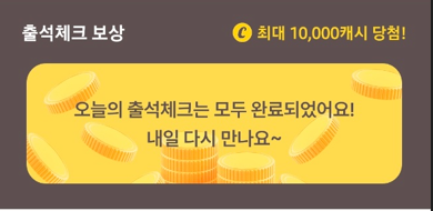 그중 하나가 출석체크. 총 3가지의 광고를 시청하여 각각의 포인트를 얻는 것으로 최대 10,000캐시를 획득할 수 있지만 현재 최고는 100캐시, 언젠가는 더 높은 것을 얻을 수 있을 거라 생각합니다.