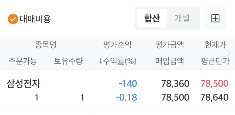 저는 78,500원에 샀지만 매매비용 수수료를 고려하면 평균단가가 78,640원입니다. 매도를 할 땐 최소 78,700원 이상이어야 손해를 보지 않겠죠?