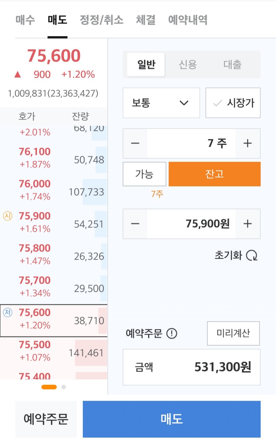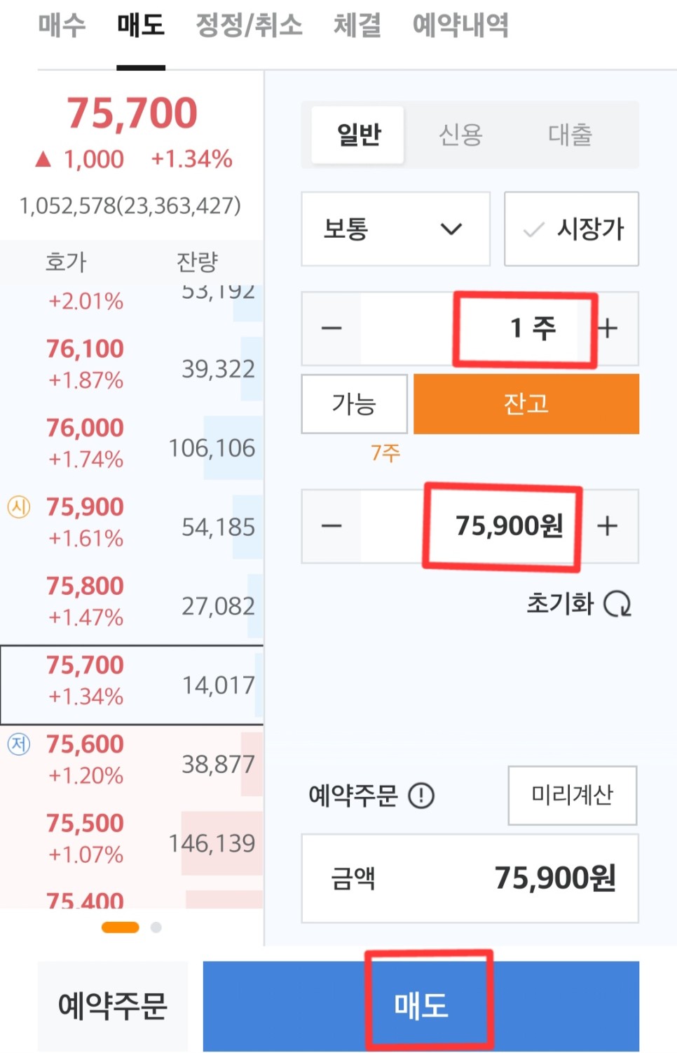 저는 1주를 꼭 팔고싶지만, 지금 가격에 팔고싶진 않았어요. 보통은 딱 떨어지는 숫자에 주식하는 방법수량이 몰려있기 때문에 그보다 1틱 (1호가 단위) 내려서 75,900원에 매도를 해봅니다.