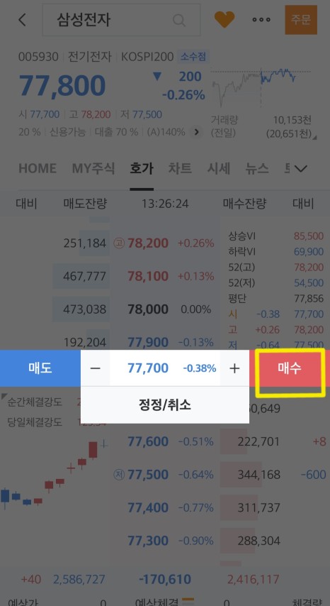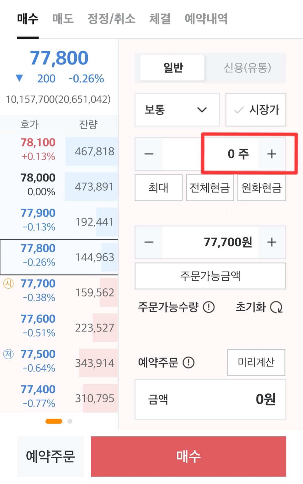 여기서 꼭 주식을 사고싶다! 라고 한다면 당연히 77,800원에 사면 되겠지만, 그보다 낮은 가격에 좀 더 지켜보면서 사고싶다면 원하는 가격에 미리 걸어두면 됩니다.