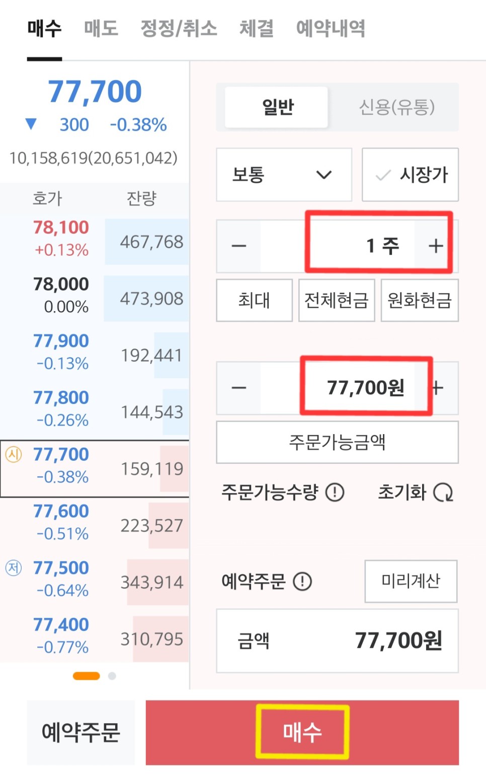 제가 원하는 77,700원에 1주를 확인했으니, 여기서 하단의 매수를 클릭하면 됩니다.