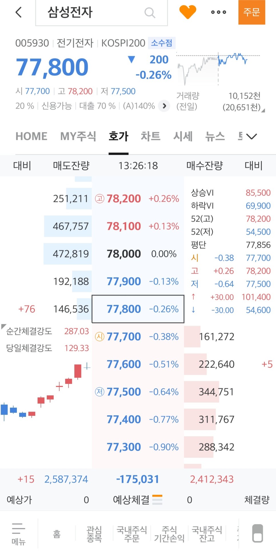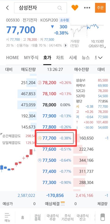 이 사진 상으로는 77,800원이며, 77,800원에 팔려고 내놓은 사람들의 주식수는 146,536주, 77,700원에 사려는 사람의 물량이 161,272주인걸 알 수 있습니다.