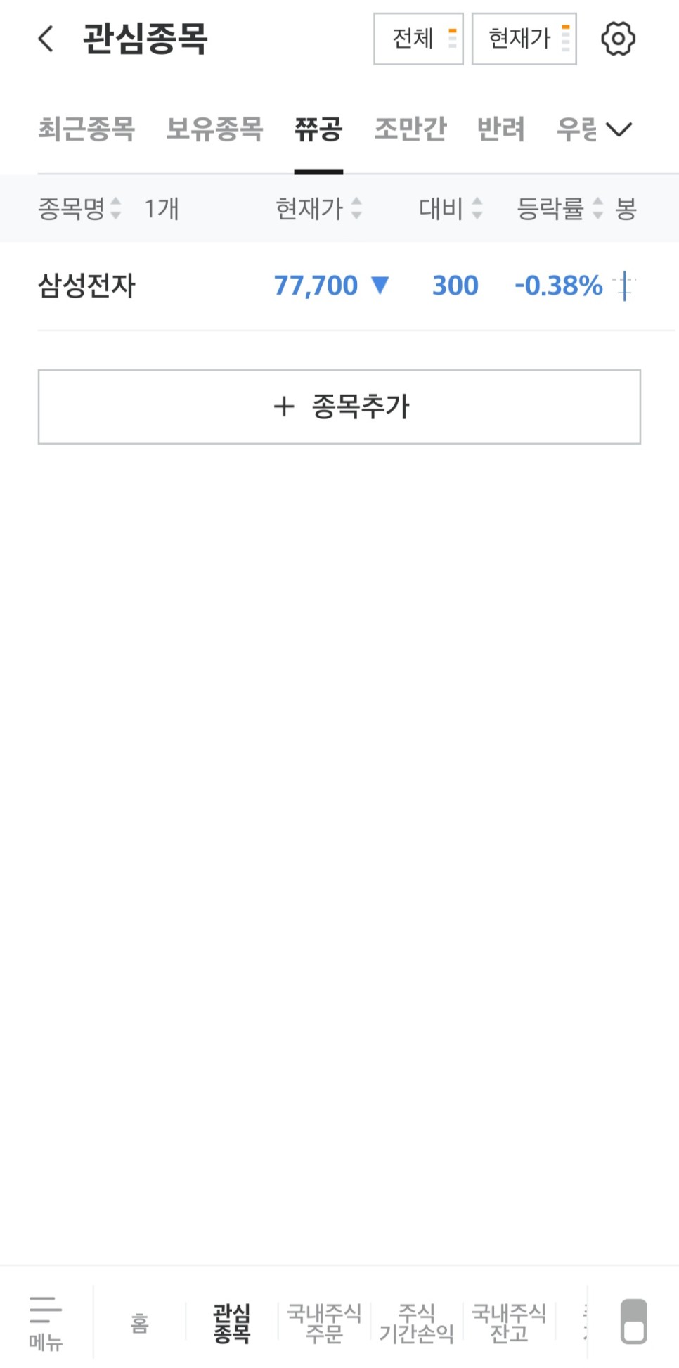 1) 관심종목에 원하는 종목인 삼성전자를 추가해놓거나, 돋보기에 종목을 검색합니다.