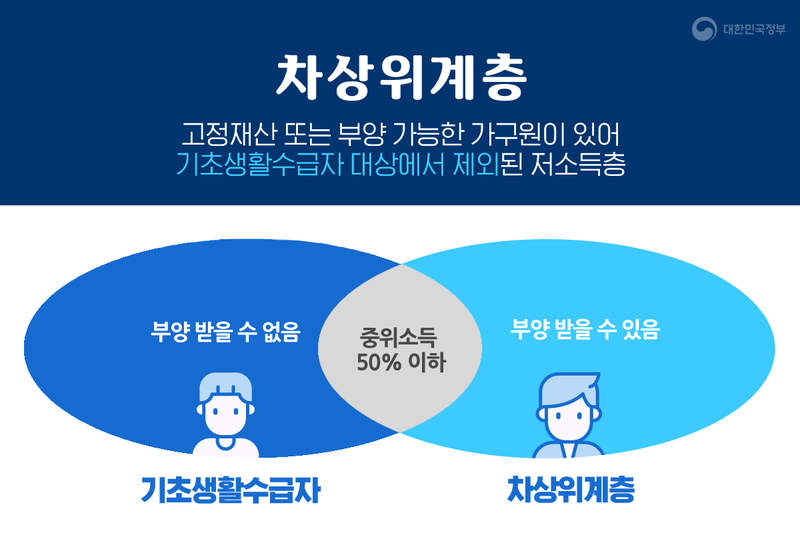 차상위계층 또한 국민기초생활보장법에 정의하고 있으며, 기초생활수급자에 해당하지 않는 계층으로 소득 인정금액이 기준 중위소득 50% 이하인 계층을 의미해요.